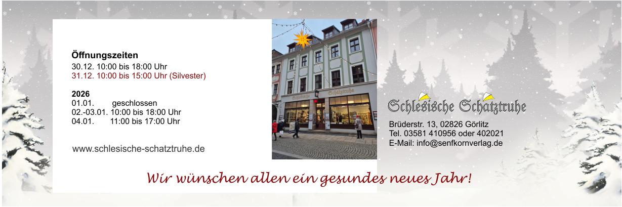 Schlesische Schatztruhe, Brüderstr. 13, 02826 Görlitz, Tel. (03581) 41 09 56, Fax (03581) 40 22 31, Diese E-Mail-Adresse ist vor Spambots geschützt! Zur Anzeige muss JavaScript eingeschaltet sein!. Onlineshops: www.schlesische-schatztruhe.de und www.bunzeltippel.de