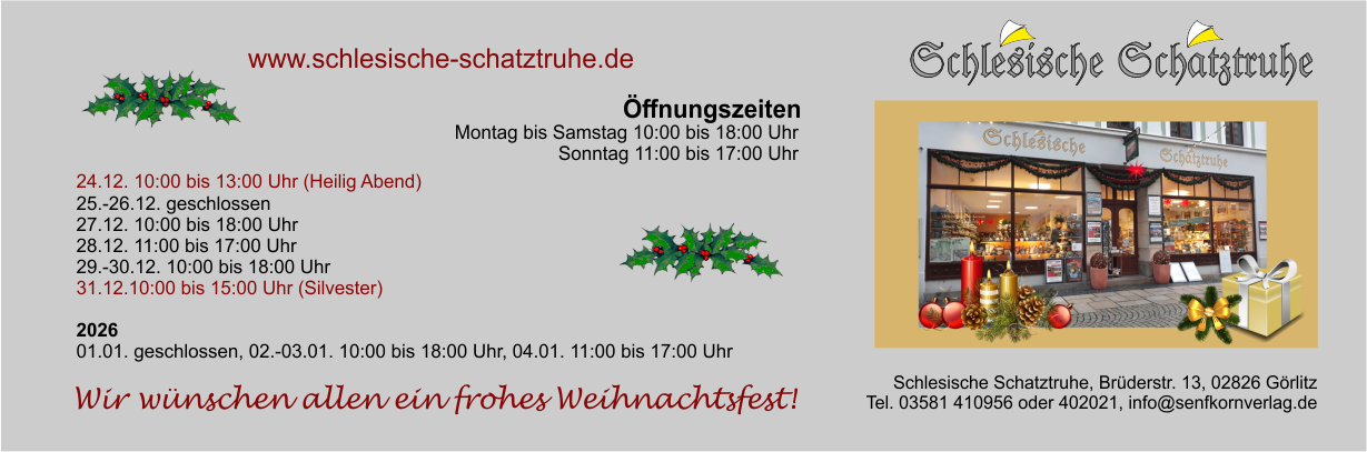 Schlesische Schatztruhe, Brüderstr. 13, 02826 Görlitz, Tel. (03581) 41 09 56, Fax (03581) 40 22 31, Diese E-Mail-Adresse ist vor Spambots geschützt! Zur Anzeige muss JavaScript eingeschaltet sein!. Onlineshops: www.schlesische-schatztruhe.de und www.bunzeltippel.de
