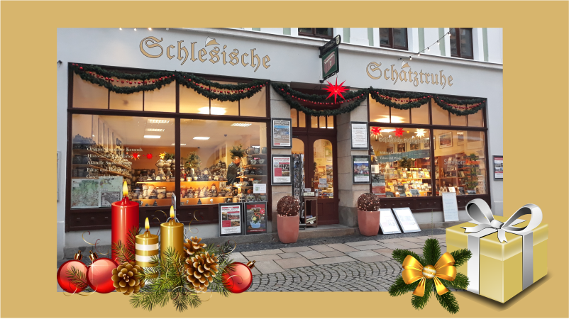 Unsere Schlesische Schatztruhe bietet eine große Auswahl an Original Bunzlauer Keramik, Herrnhuter Sternen, regionalen Köstlichkeiten wie zum Beispiel Oberlausitzer Eierlikör und Liegnitzer Bomben sowie Bücher, Reiseführer, aktuelle Karten über Schlesien, Polen und Ostmitteleuropa bis hin zum Monatsmagazin „Schlesien heute.